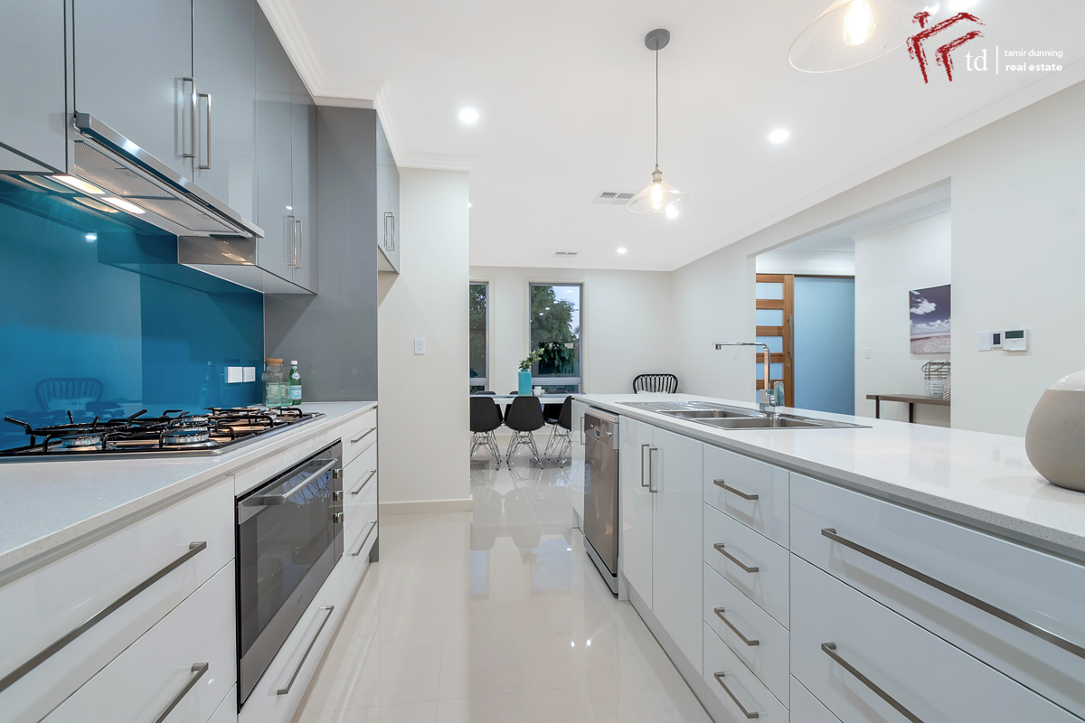 A free flowing design to the lower level maximizes the effortless transition from large open plan living to outdoor alfresco entertaining while making the most of an abundance of natural light. All of this being complemented with a stunning designer kitchen with 900mm stainless steel appliances, feature aluminum splash back which certainly makes a statement and pendent lighting to the island bench.